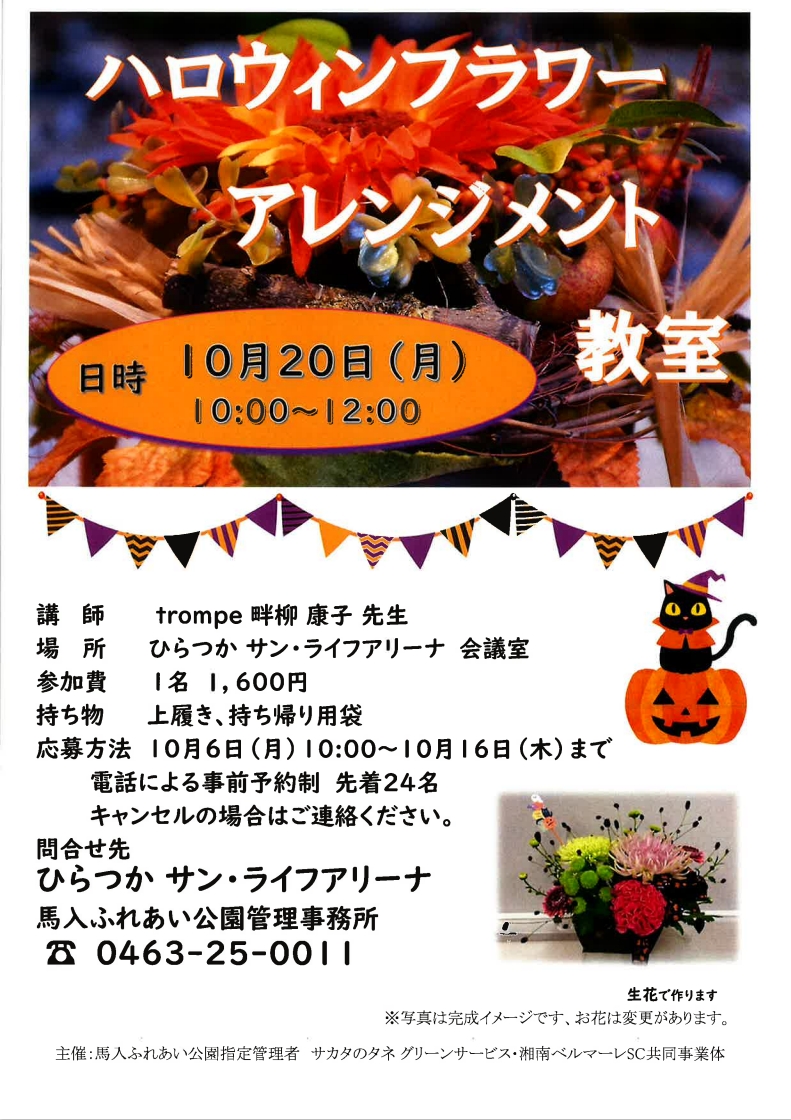 【終了しました】ハロウィンフラワーアレンジメント教室開催 生花を使用して秋のハロウィン風アレンジメントを行います。 初心者でも先生が優しく指導してくれますので安心です。 ぜひご参加ください! 馬入ふれあい公園管理事務所 ※この教室は終了しました。