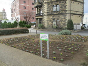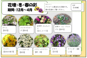 原っぱの花壇へは『タイム』『クリスマスローズ』『金魚草』『耐寒マラコイデス』『パンジー』『ノースポール』『バラ(ノック・アウト)』『ビオラ』『ラベンダー』が植えられています。