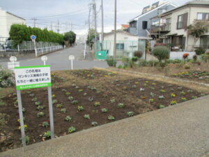 先日、公園内原っぱの花壇と南端の花壇の花を冬~春の花に植え替えしました。