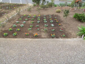 南端の花壇は、毎年松原老人クラブさんとサン・キッズ湘南さんにご協力いただき花壇の整備をしていましたが、今年はコロナウイルス対策のため、職員のみでの植え替えになりました。