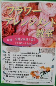フラワーアレンジメント教室 終了致しました。ご参加ありがとうございました。 5月20日(月)10:00~ フラワーアレンジメント教室開催いたします! ご予約はお電話にて、5月20日10:00~承ります。 ☎ 0463‐25‐0011 お待ちしております。