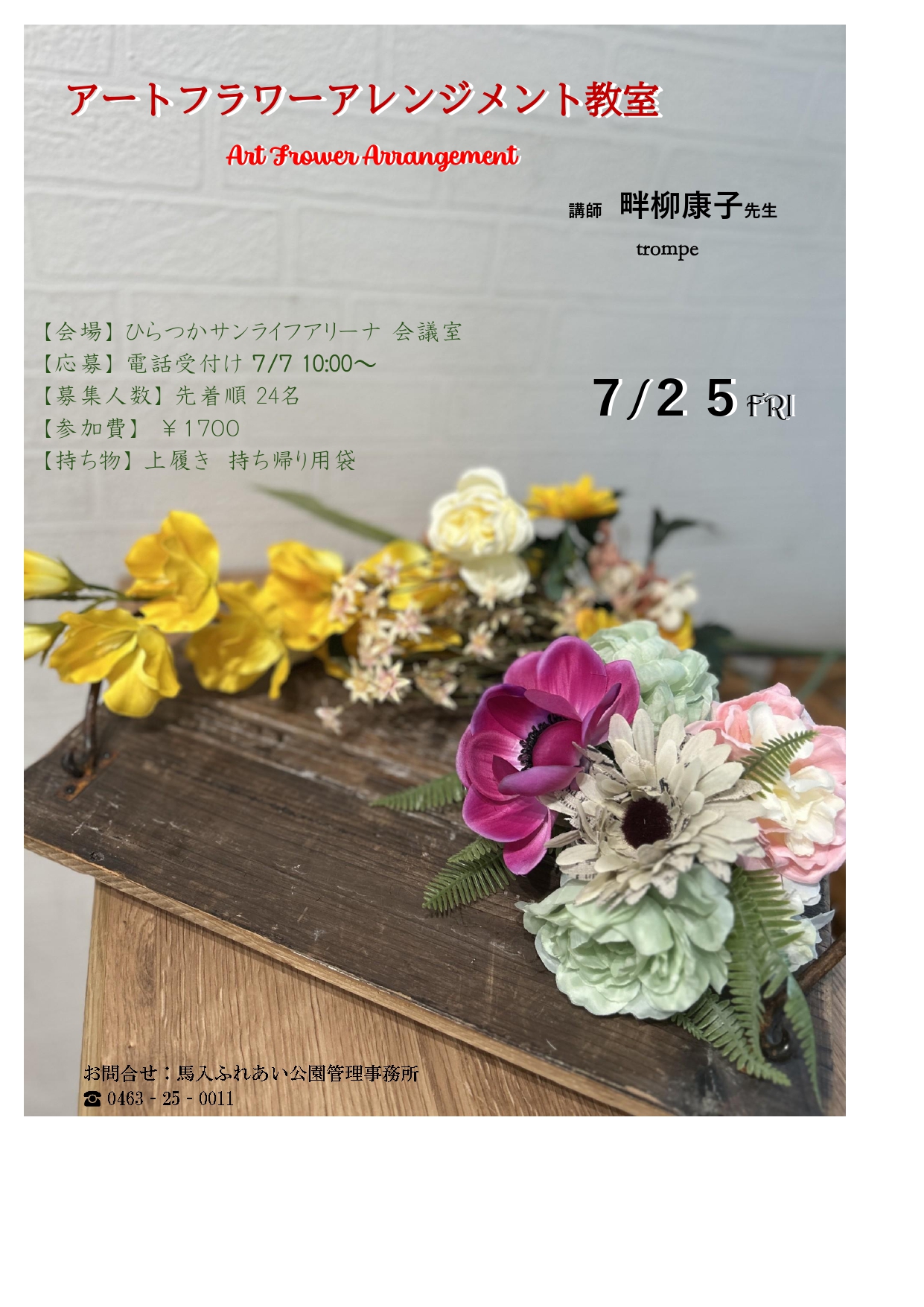 【終了しました】アートフラワーアレンジメント教室開催 今回のフラワー教室は「アートフラワーアレンジメント教室」です。 造花を使い、本物そっくりにアレンジメントしていきます。 夏休み中のお子様も是非ご参加ください。 教室は終了しました