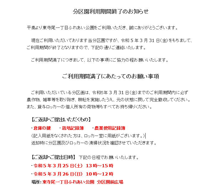 令和4年度 分区園利用期間満了のお知らせとお願い事項