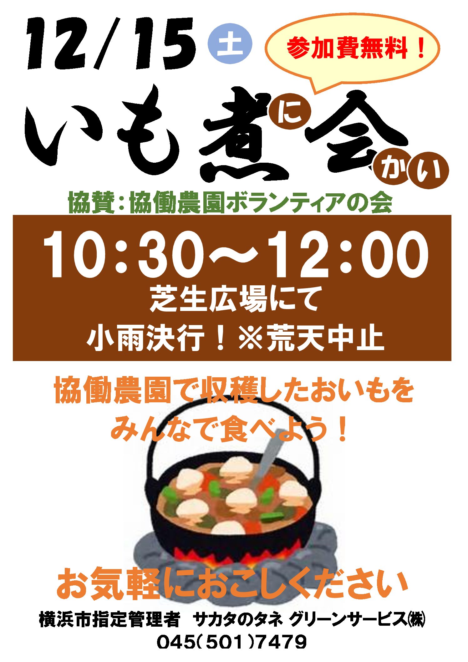 いも煮会のお知らせ 12月15日(土)10時30分~12時 いも煮会を開催します。 場所は東寺尾一丁目ふれあい公園の芝生広場にて行います。 協働農園ボランティアの会で収穫したおいもを皆さんと食べましょう! お気軽におこしください!!