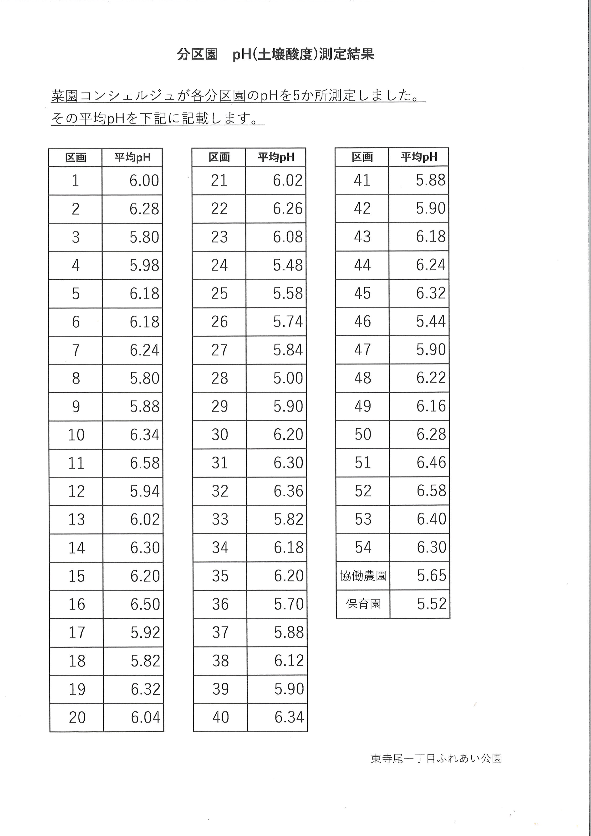 各分区園のpH(土壌酸度)値の測定結果 当公園の菜園コンシェルジュが各分区園のpH(土壌酸度)の測定を実施しました。 4月からの菜園づくりにぜひ活かしてください。 ・pH(土壌酸度)について ・各分区園のpH(土壌酸度)の測定結果について