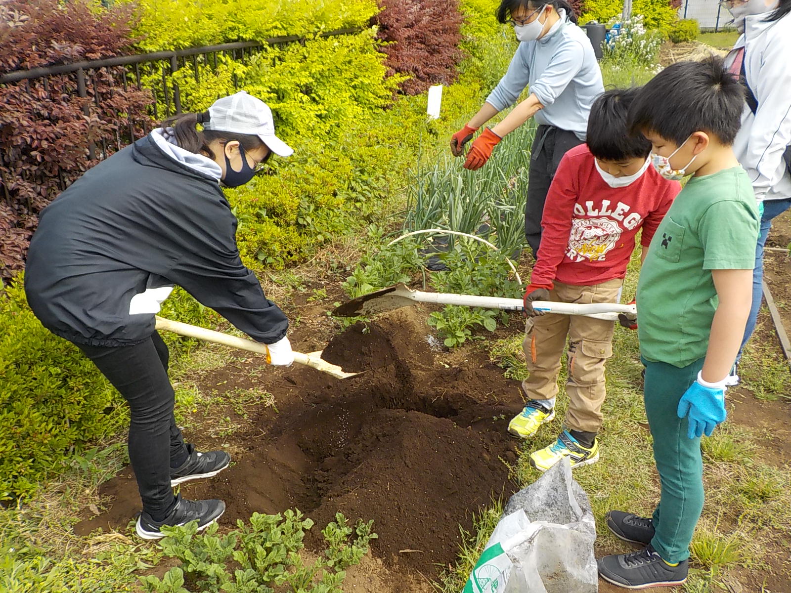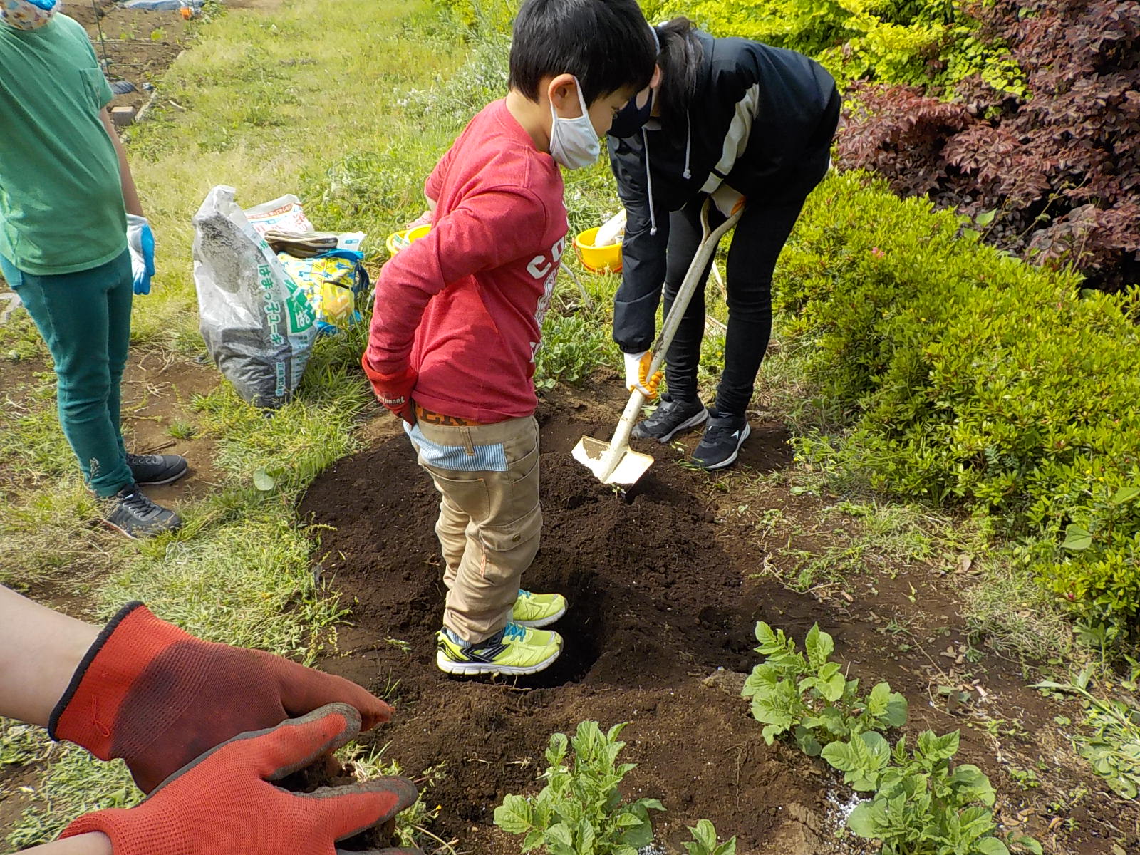 ちびっ子農園では、ジャガイモ作付けを子供たちがお手伝いしてました。