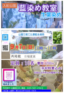 ※定員に達しましたので募集も〆切させていただきます 先生と相談して9月7日(日)14:00~16:00に藍染教室を 開催いたします。 「いつも入船公園をご利用頂き有難うございます。 8月17日 ...