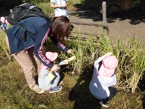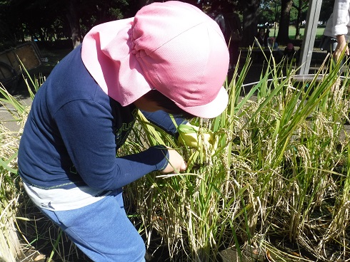 下から刈り取るのは危ないので、稲穂だけを切り取る方式で行いました。