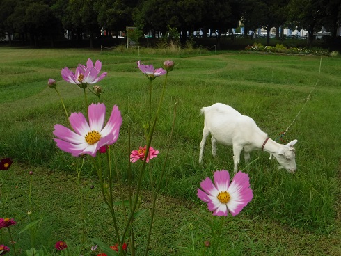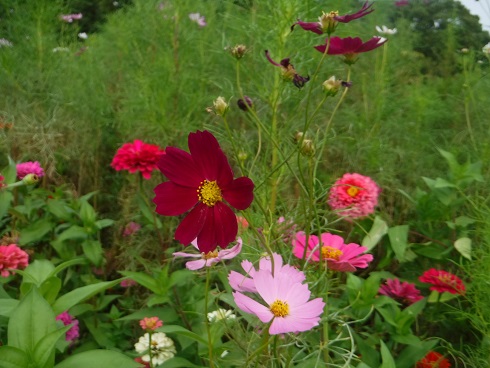 自由広場の真ん中にあるお花畑のコスモスとジニア