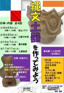 9月23日から4回にわたって縄文土器作りをします。4回分で300円で体験できます。電話・Fax045-501-2343 入船公園管理事務所まで皆様の参加をお待ちしています。