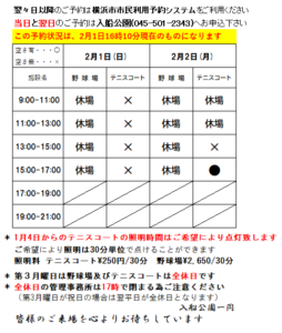 いつも入船公園をご利用いただき有難うございます。 2月21(土)~3月20日(金)までの野球場の予約状況です。 表をご参照のうえ、ご予約ください。 1団体につき2コマまでです。 ※3月17日(火)13 ...