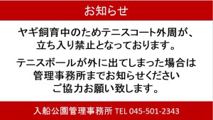 テニスコート裏でヤギを飼育している影響で、テニスコート裏に出る扉のカギを閉鎖しております。閉鎖期間は10月中旬までの予定です。ご理解とご協力をお願い致します。