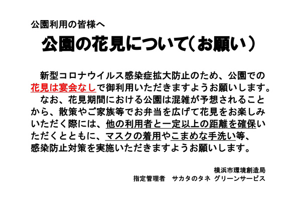 公園のお花見について いつも入船公園をご愛顧頂き、誠にありがとうございます。 新型コロナウイルス感染拡大防止の為のお知らせです。 園内での飲酒はお控え頂きますようお願い致します。 ご協力お願い致します。