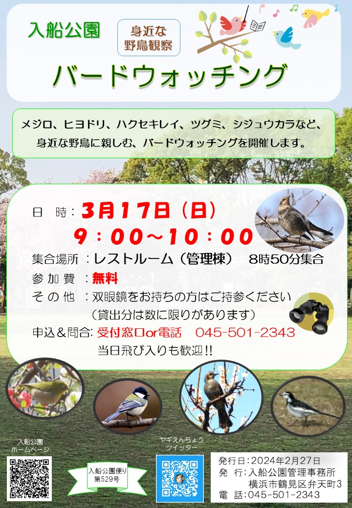 バードウォッチング 3月17日(日) 9時~10時 バードウォッチング 公園職員と入船公園を巡って行う『バードウォッチング』を開催いたします。 園内には日々メジロやヒヨドリ、ムクドリ、ハクセキレイ、ツグミ、シジュウカラ、メジロ、ウグイス、スズメ等 たくさんの野鳥が生息しております。 そんな野鳥の生活を身近で観察して頂けます。 参加費無料、双眼鏡貸し出し有です。(数に限りがある為、お持ちの方はご持参ください) ぜひお気軽にご参加くださいね。