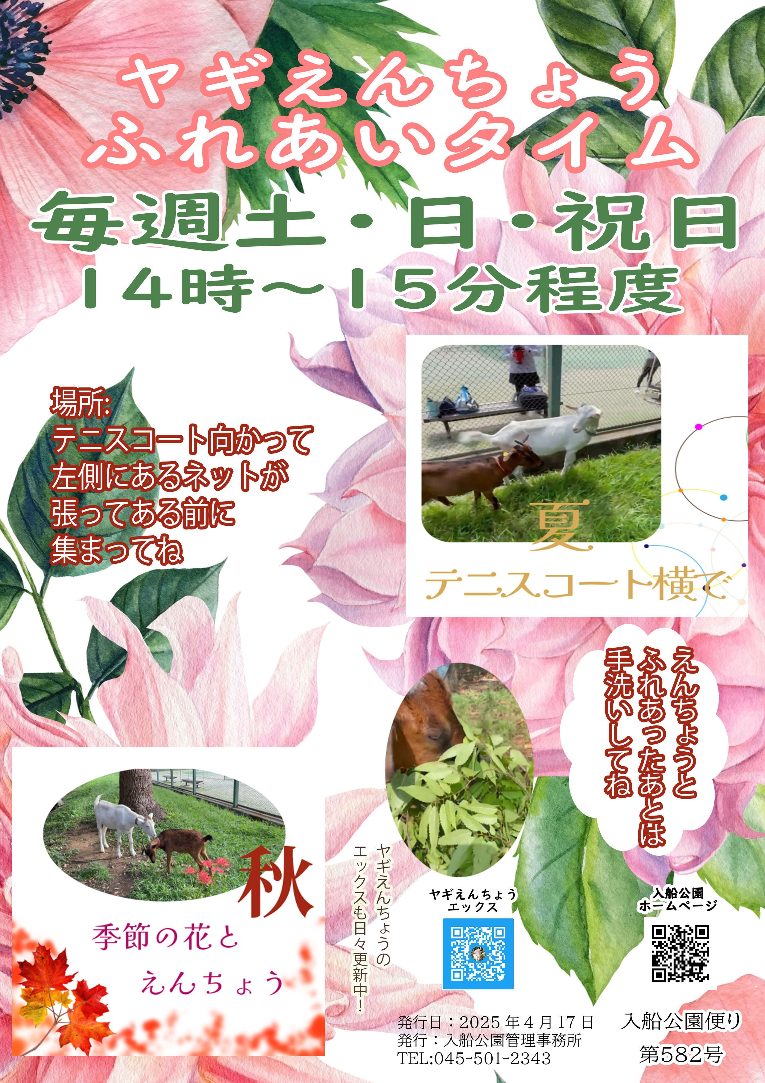 やぎえんちょうふれあいタイム開始しています。(土日祭日 限定 午後2時より)※雨天中止 いつも入船公園をご利用頂き有難うございます。 今年もやぎえんちょうふれあいタイムを 今週4月19日(土)から秋ごろまで 開催いたしています。 子供から大人まで癒されてください。 詳しくはポスターをご覧ください。 ※雨天中止