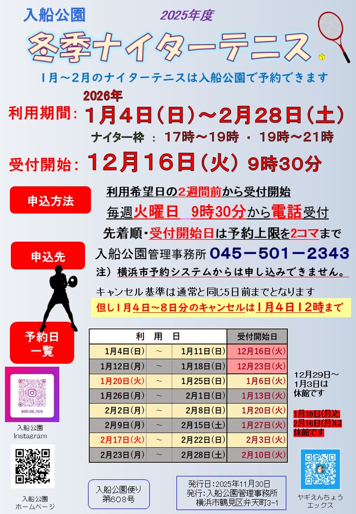 1月と2月の夜の時間帯のナイターテニスは横浜市の予約システムの方ではなくて