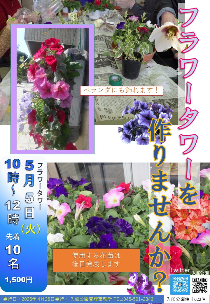 5月5日(火・祝) フラワータワー教室※先着10名様 いつも入船公園をご利用いただき有難うございます。 5月5日(火・祝)に入船公園でフラワータワー教室を開催します。 ペットボトルと夏に咲く花苗を使って、お家に飾れるフラワータワーを作りませんか。 作ったフラワータワーは吊り下げて飾れます。 参加費は1,500円で先着10名様です。 (使用する花苗は後日、発表します。) ぜひ、ご参加ください。