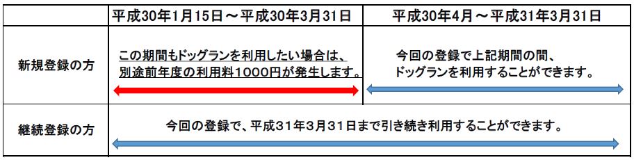 ☆平成30年1月15日~平成30年3月31日の期間に利用登録をし、前年度のドッグランの登録をされていない方で、平成30年4月1日からドッグランをご利用される方