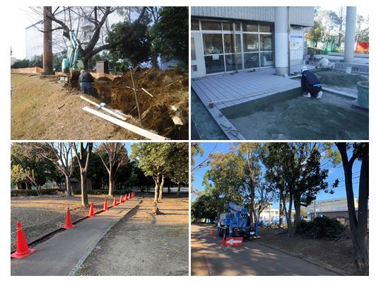 現在、野球場・管理事務所前等の工事に加え、高木の剪定作業も実施しているため、園内の車両の通行が多くなっております。
