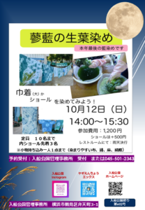 ※定員に達しました。 いつも入船公園をご利用頂き有難うございます。 先月好評でした藍染めを10月12日に開催します。 先月開催した時より、暑さもやわらぐ秋の夜長。 先月に参加を検討していた方もこの機会 ...