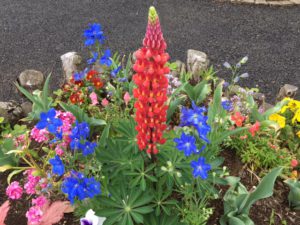 画面中心の真っ赤なルピナスと色鮮やかなデルフィニウム ミントブルーが綺麗に咲いています。