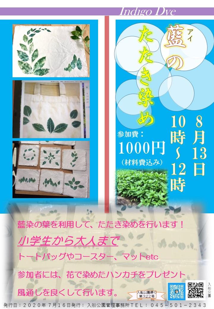 カレンダーに戻る 藍のたたき染め 2020年8月13日 @ 10:00 - 12:00 | 1000円 イベント ナビゲーション 人気の草木染めに続き今回は気軽にできるたたき染めが体験できます。 ランチョンマットやコースター、トートバッグ等に草木で模様付けをする予定です。 詳細 日付: 2020年8月13日 時間: 10:00 - 12:00 参加費: 1000円 イベントカテゴリー: イベント 会場 入船公園行事予定