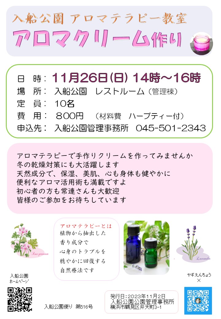 カレンダーに戻る アロマテラピー教室 2023年11月26日 @ 14:00 - 16:00 | 800円 イベント ナビゲーション 天然アロマで万能クリームをつくります♪ 詳細 日付: 2023年11月26日 時間: 14:00 - 16:00 参加費: 800円 イベントカテゴリー: イベント 会場 入船公園行事予定