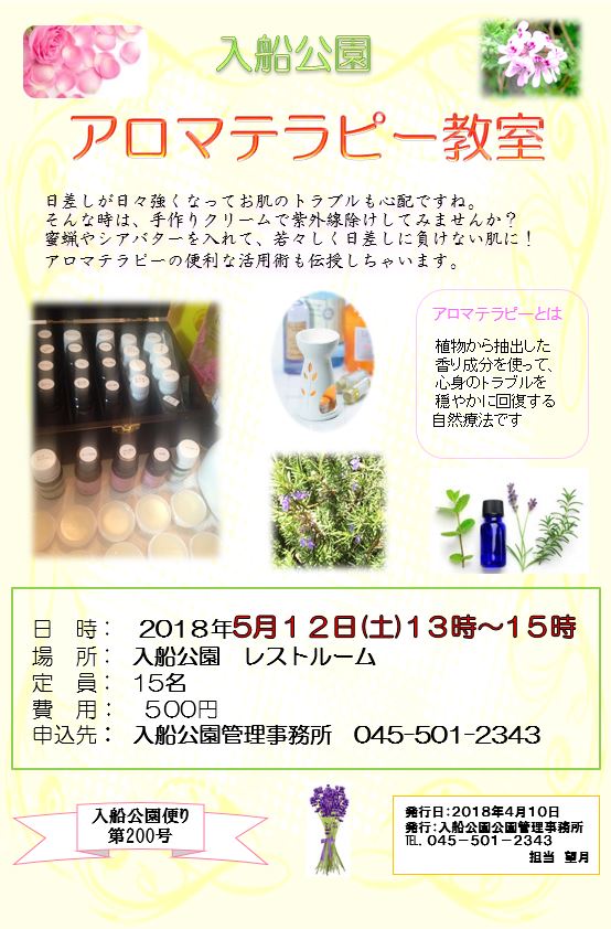 カレンダーに戻る アロマテラピー教室 2018年5月12日 @ 13:00 - 15:00 | 500円 イベント ナビゲーション 詳細 日付: 2018年5月12日 時間: 13:00 - 15:00 参加費: 500円 主催者 サカタのタネ グリーンサービス株式会社 電話番号: 045-501-2343 会場 入船公園行事予定