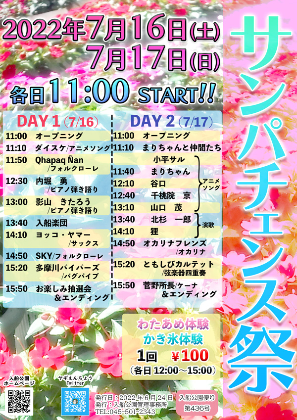 カレンダーに戻る サンパチェンス祭 2022年7月16日 @ 11:00 - 2022年7月17日 @ 16:00 | 無料 イベント ナビゲーション 詳細 開始: 2022年7月16日 @ 11:00 終了: 2022年7月17日 @ 16:00 参加費: 無料 イベントカテゴリー: イベント 会場 入船公園行事予定