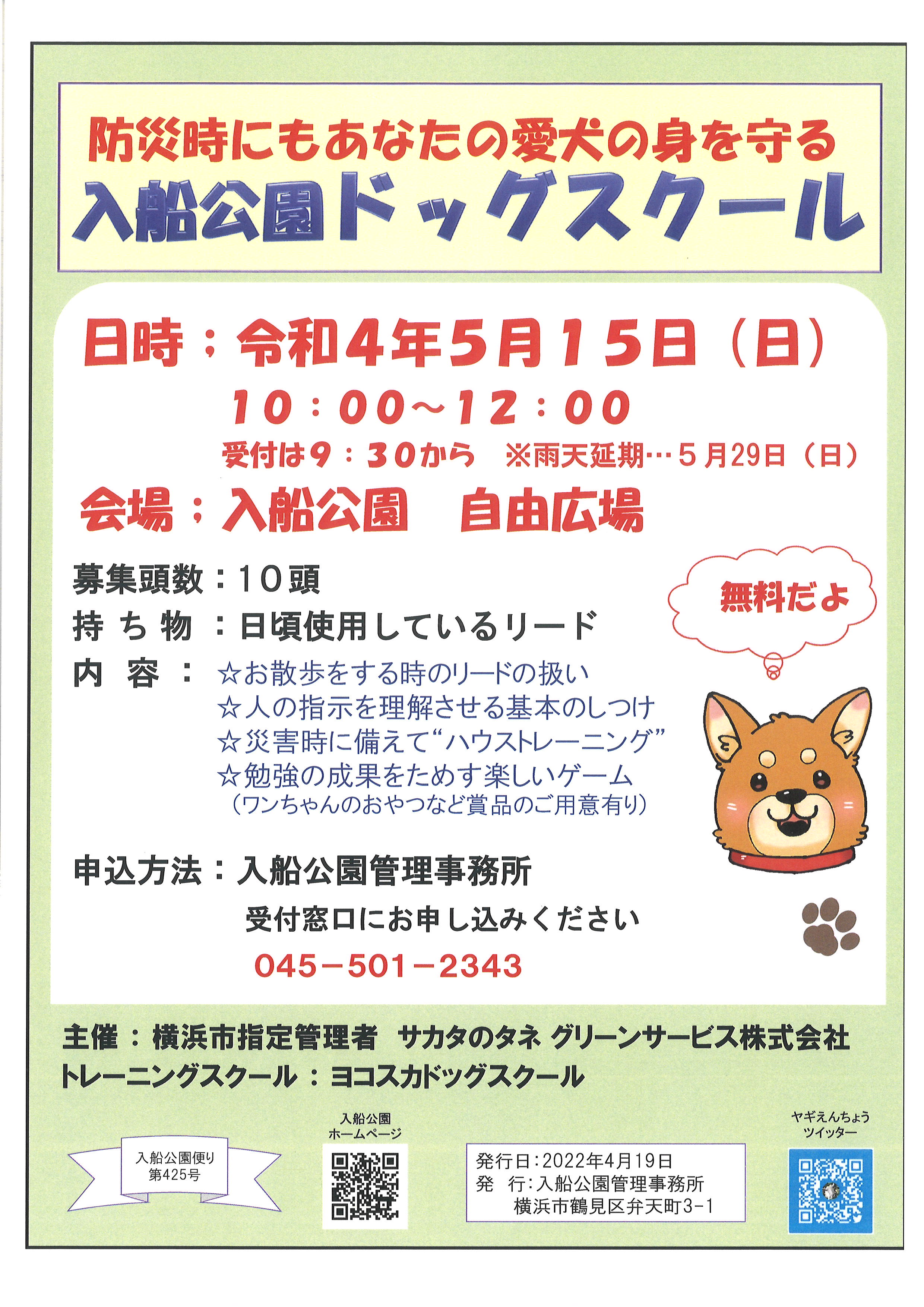 カレンダーに戻る ドッグスクール 2022年5月15日 @ 10:00 - 12:00 | 無料 イベント ナビゲーション 定員 10頭 詳細 日付: 2022年5月15日 時間: 10:00 - 12:00 参加費: 無料 イベントカテゴリー: イベント 会場 入船公園行事予定