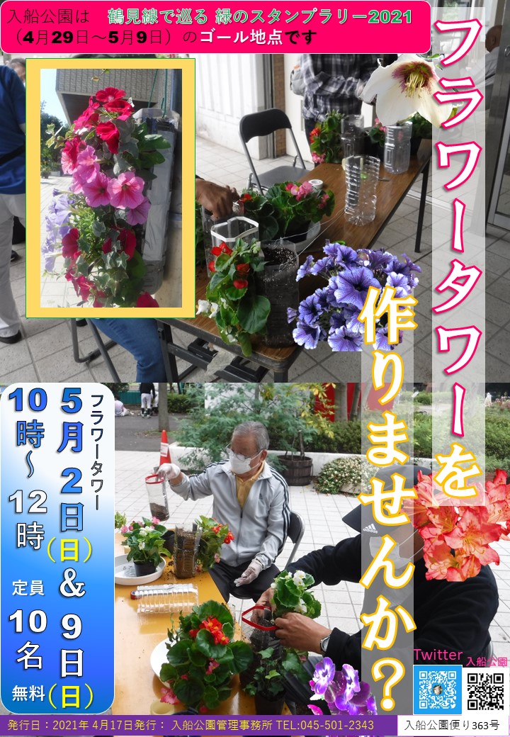 カレンダーに戻る フラワータワー作り教室 2021年5月2日 @ 10:00 - 12:00 | 無料 イベント ナビゲーション 開始時間:10時30分~ 定員 10名 詳細 日付: 2021年5月2日 時間: 10:00 - 12:00 参加費: 無料 イベントカテゴリー: イベント 会場 入船公園行事予定