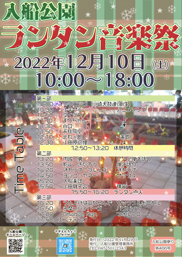 カレンダーに戻る ランタン音楽祭 2022年12月10日 | 無料 イベント ナビゲーション 詳細 日付: 2022年12月10日 参加費: 無料 イベントカテゴリー: イベント 会場 入船公園行事予定