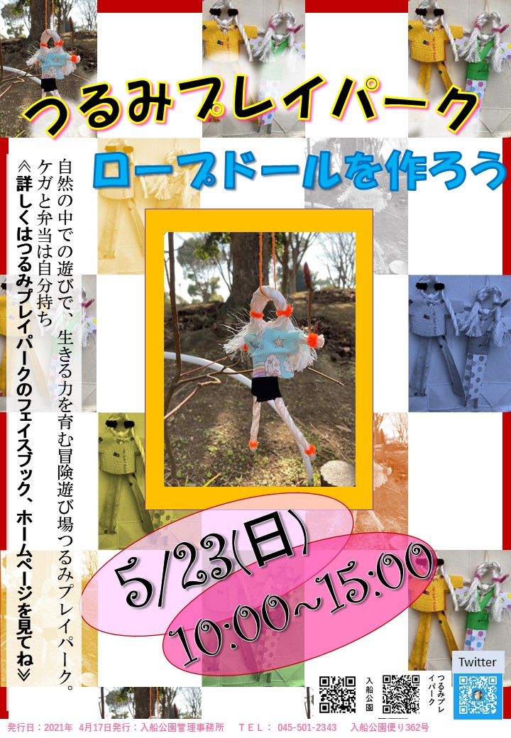 カレンダーに戻る ロープドールを作ろう 2021年5月23日 @ 10:00 - 15:00 | 無料 イベント ナビゲーション 詳細 日付: 2021年5月23日 時間: 10:00 - 15:00 参加費: 無料 イベントカテゴリー: イベント 主催者 つるみプレイパーク メール: tsurumipp@gmail.com Web サイト: https://sites.google.com/view/tsurumipp/home 会場 入船公園行事予定