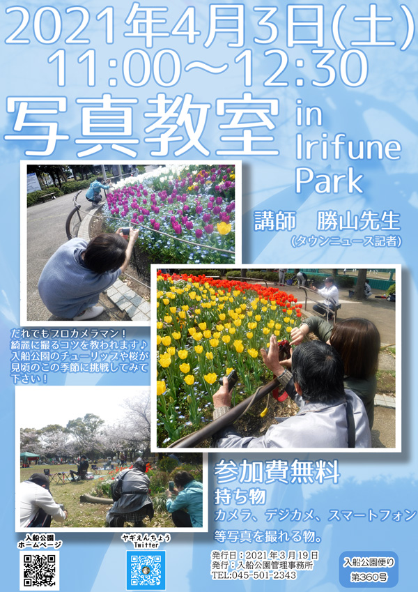 カレンダーに戻る 写真教室 2021年4月3日 @ 11:00 - 12:30 | 無料 イベント ナビゲーション 詳細 日付: 2021年4月3日 時間: 11:00 - 12:30 参加費: 無料 イベントカテゴリー: イベント 会場 入船公園行事予定