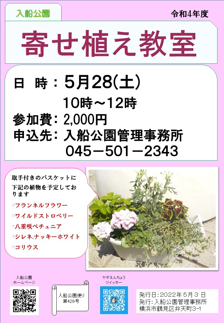 カレンダーに戻る 寄せ植え教室 2022年5月28日 @ 10:00 - 12:00 | 2,000円 イベント ナビゲーション 定員 10名 詳細 日付: 2022年5月28日 時間: 10:00 - 12:00 参加費: 2,000円 イベントカテゴリー: イベント 会場 入船公園行事予定
