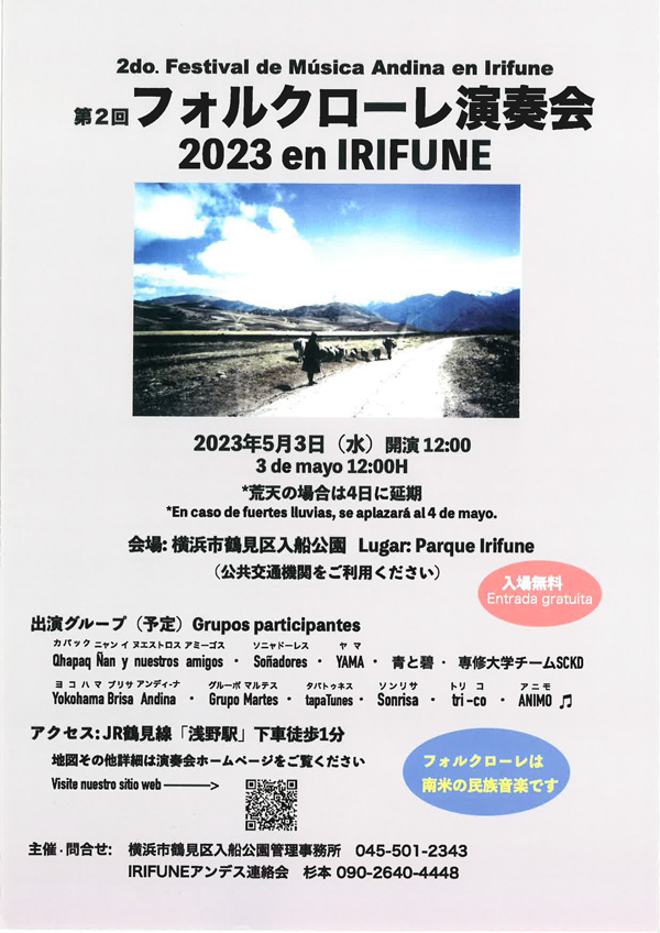 カレンダーに戻る 第2回フォルクローレ演奏会 2023年5月3日 @ 12:00 - 16:30 | 無料 イベント ナビゲーション 詳細 日付: 2023年5月3日 時間: 12:00 - 16:30 参加費: 無料 イベントカテゴリー: イベント 会場 入船公園行事予定
