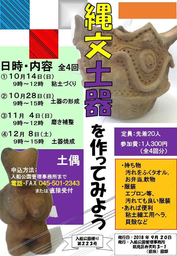 カレンダーに戻る 縄文土器を作ってみよう① 2018年10月14日 @ 09:00 - 12:00 | 300円 イベント ナビゲーション 詳細 日付: 2018年10月14日 時間: 09:00 - 12:00 参加費: 300円 会場 入船公園行事予定