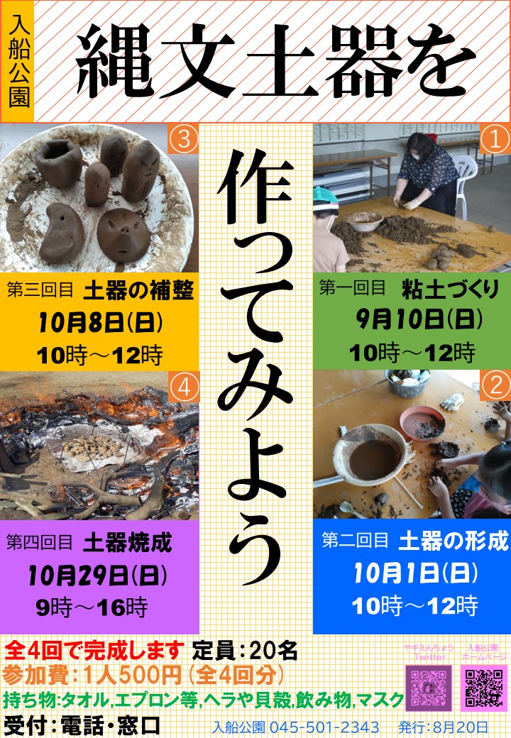 カレンダーに戻る 縄文土器作り④(全4回) 2023年10月29日 @ 09:00 - 16:00 | 500円 イベント ナビゲーション 詳細 日付: 2023年10月29日 時間: 09:00 - 16:00 参加費: 500円 イベントカテゴリー: イベント 会場 入船公園行事予定