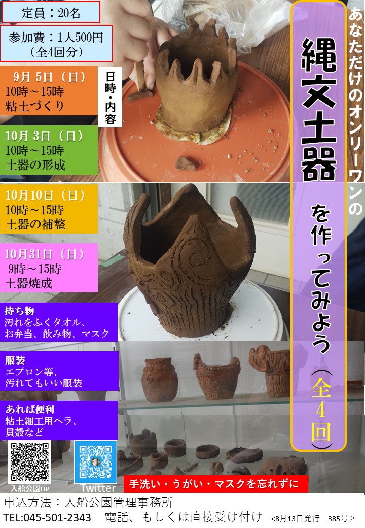カレンダーに戻る 縄文土器作り 2021年10月3日 @ 10:00 - 15:00 | 円500 イベント ナビゲーション 10月3日(日)の「土器の形成」から開始します! 全3回でオンリーワンの縄文土器を作ってみませんか? 参加費¥500で全3回全てご参加頂けます。 ※現在入船公園では新型コロナウイルス感染拡大防止の為、 手洗い、アルコール消毒、マスクの着用等による咳エチケット、 密集、密接を避けたご利用をお願いしております。 少しでも体調が優れない場合は無理せず、 ご来園をお控え頂きますようお願い致します。 ご理解、ご協力をお願い致します。 詳細 日付: 2021年10月3日 時間: 10:00 - 15:00 参加費: 円500 イベントカテゴリー: イベント 会場 入船公園行事予定