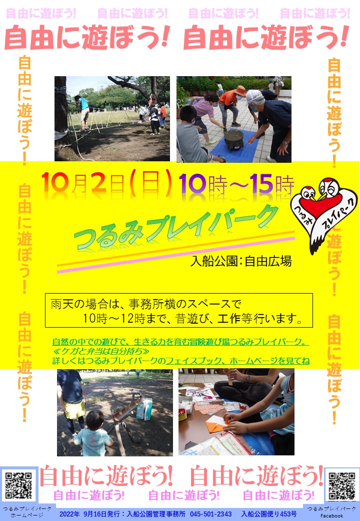 カレンダーに戻る 自由に遊ぼう 2022年10月2日 @ 10:00 - 15:00 | 無料 イベント ナビゲーション 詳細 日付: 2022年10月2日 時間: 10:00 - 15:00 参加費: 無料 イベントカテゴリー: イベント 主催者 つるみプレイパーク メール: tsurumipp@gmail.com Web サイト: https://sites.google.com/view/tsurumipp/home 会場 入船公園行事予定