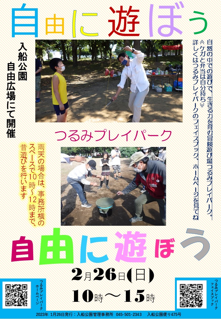 カレンダーに戻る 自由に遊ぼう 2023年2月26日 @ 10:00 - 15:00 | 無料 イベント ナビゲーション 詳細 日付: 2023年2月26日 時間: 10:00 - 15:00 参加費: 無料 イベントカテゴリー: イベント 主催者 つるみプレイパーク メール: tsurumipp@gmail.com Web サイト: https://sites.google.com/view/tsurumipp/home 会場 入船公園行事予定