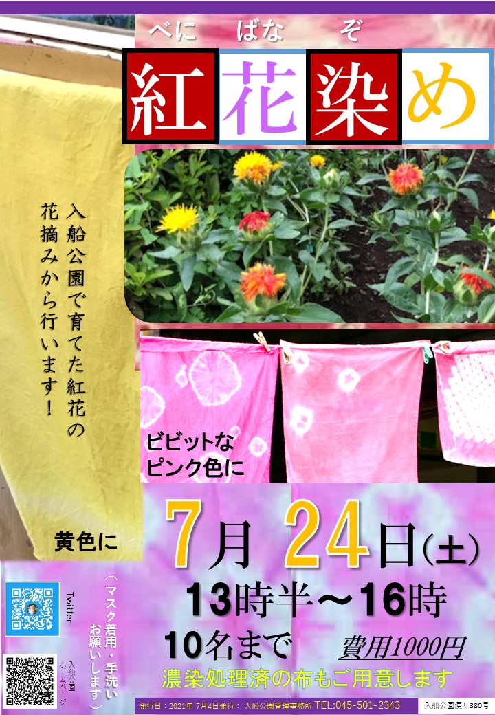 カレンダーに戻る 草木染め(紅花染) 2021年7月24日 @ 13:30 - 16:00 | 1000円 イベント ナビゲーション 定員 10名 詳細 日付: 2021年7月24日 時間: 13:30 - 16:00 参加費: 1000円 イベントカテゴリー: イベント 会場 入船公園行事予定