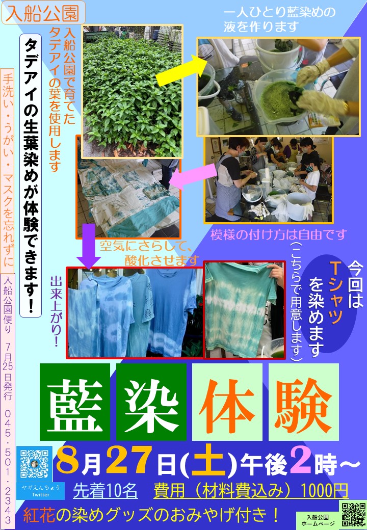 カレンダーに戻る 藍染め 2022年8月27日 @ 14:00 - 16:00 | 1000円 イベント ナビゲーション 定員 10名 詳細 日付: 2022年8月27日 時間: 14:00 - 16:00 参加費: 1000円 イベントカテゴリー: イベント 会場 入船公園行事予定