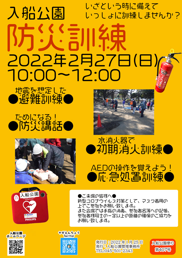 カレンダーに戻る 防災訓練 2022年2月27日 @ 10:00 - 12:00 | 無料 イベント ナビゲーション 詳細 日付: 2022年2月27日 時間: 10:00 - 12:00 参加費: 無料 イベントカテゴリー: イベント 会場 入船公園行事予定