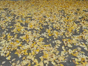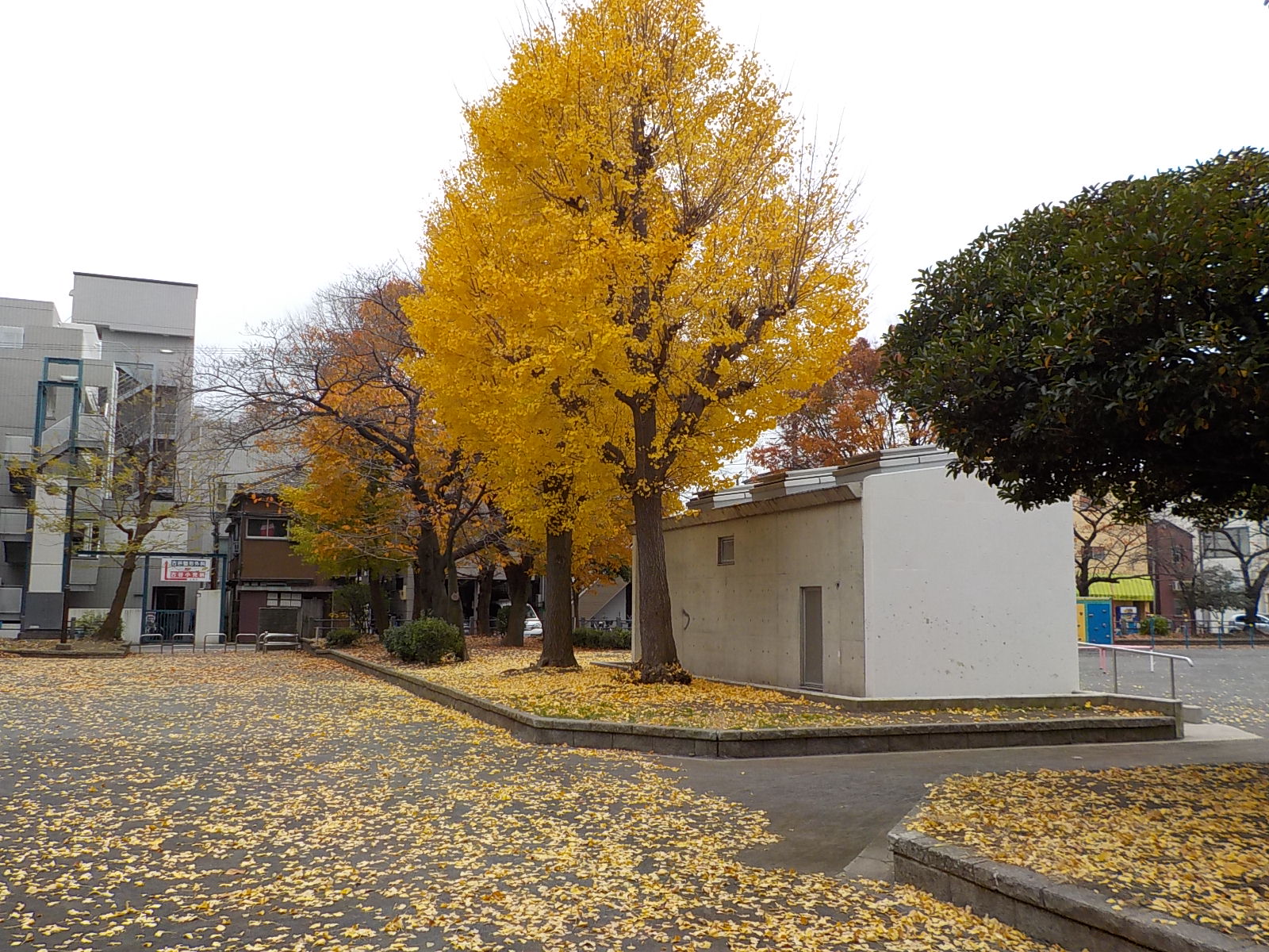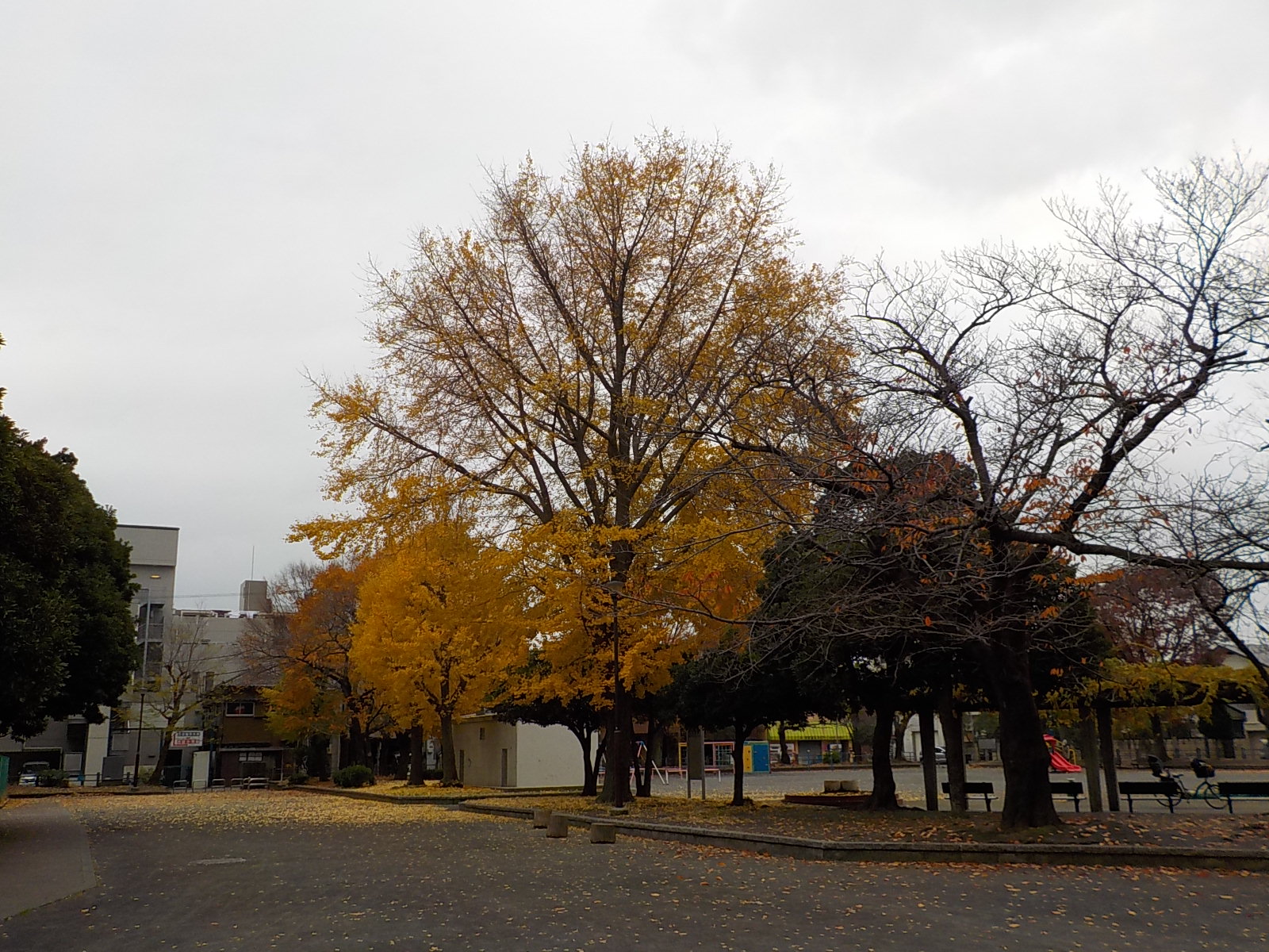 立派な大イチョウと小さなイチョウで遊具広場入口は黄色いじゅうたんになります。