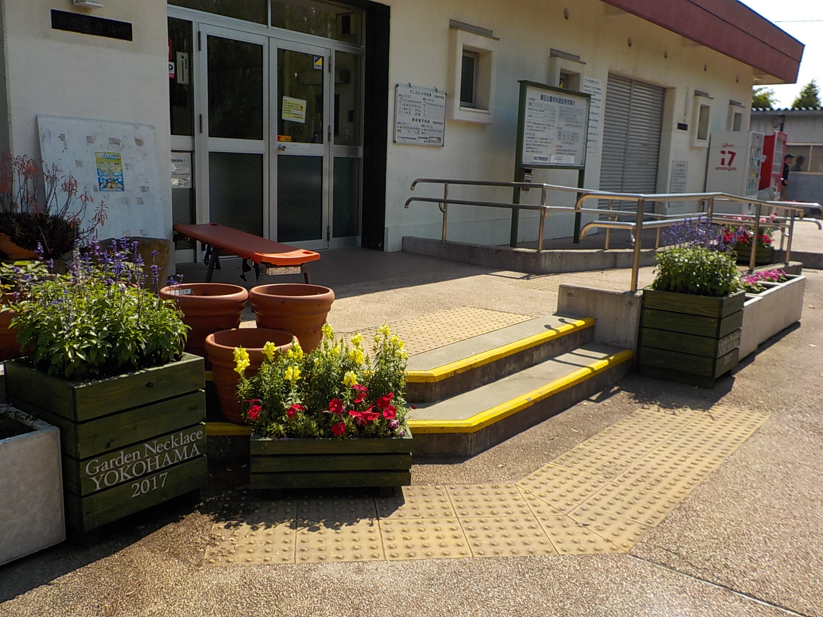 先日に横浜市緑化よこはまフェアから頂きましたリサイクル品を事務所前に飾りました。