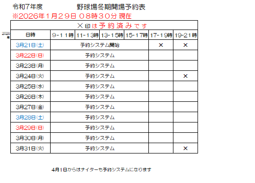 令和7年度 野球場冬期開場予約表