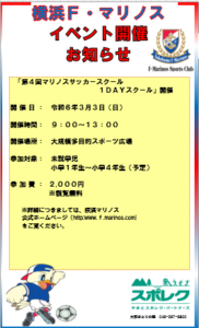 「第4 回 マリノスサッカースクール 1DAYスクール」開催のお知らせ。 「第4回 マリノスサッカースクール 1DAYスクール」 開催のお知らせ。 詳しくはこちらをクリック。 皆様のご参加を、心よりお待ちしております。!! ... 続きを読む