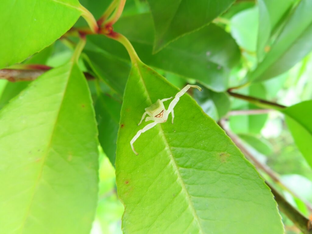 レッドロビンの茂みを覗くと、真っ白なクモが