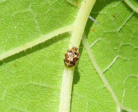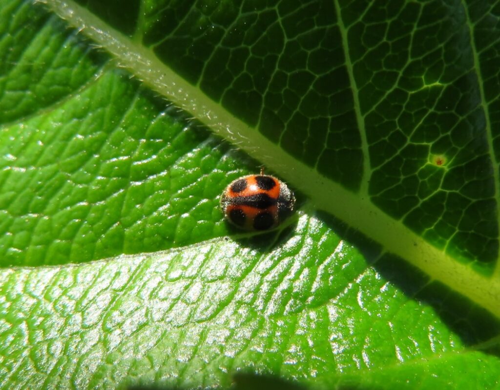 タニウツギの葉っぱにいたのは、モンクチビルテントウという、小さなテントウムシです。